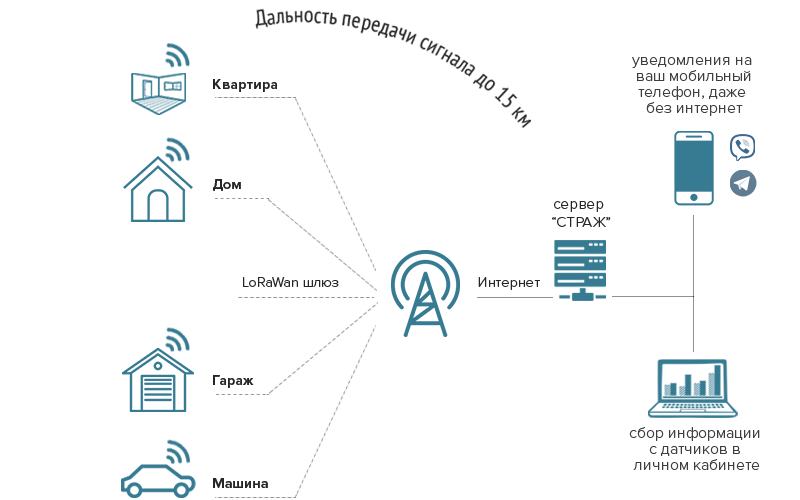 Сеть LoRaWAN позволит передавать данные о устройствах, датчика охраны "СТРАЖ", датчик дыма, датчик температуры и др. без использования интернет и мобильной сети GSM